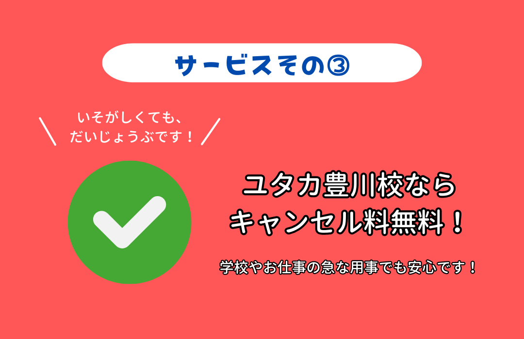 「学校の先生から居残り指令が…!」や「急な残業…」など、忙しい方をユタカ豊川校は応援します!電話1本でキャンセル&スケジュールの組みなおしを行います!