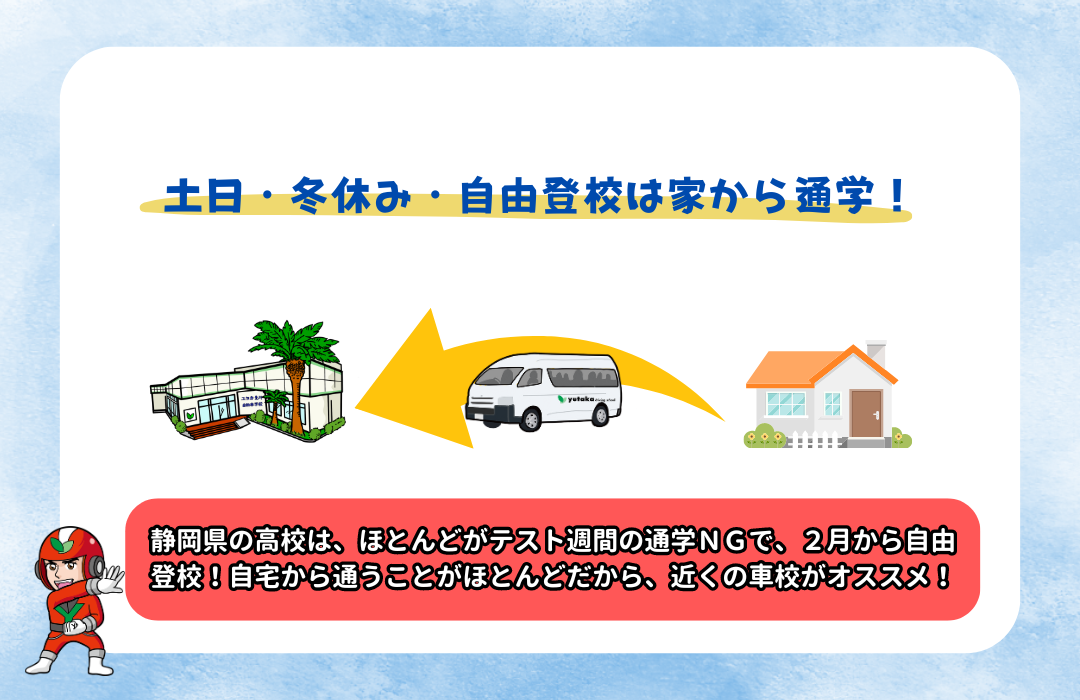 土日や長期休みも利用して自動車学校に通学する場合は、自宅付近の自動車学校がオススメです!学校付近の自動車学校は帰りがけに通えるメリットはありますが、皆同じように考えるので予約が取りにくくなる場合があります。ご注意ください。