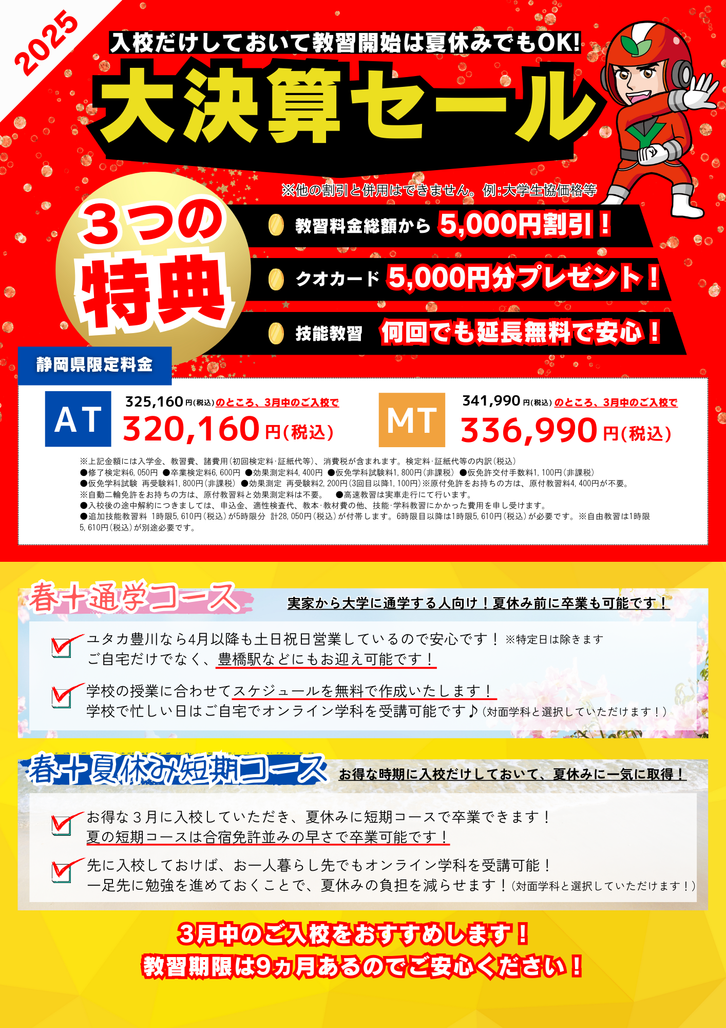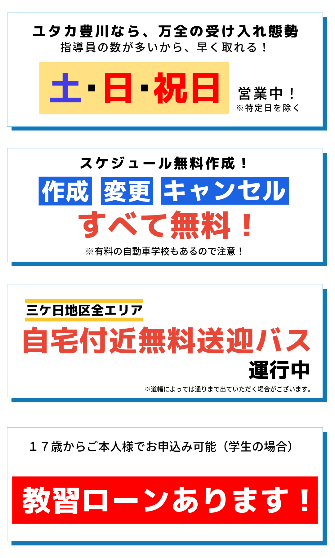 スケジュール作成や卒業期間によってオプション料金を設定している自動車学校もあります。また、予定変更は〇日前に連絡をしないとキャンセル料金が発生する自動車学校もあります。自動車学校を選ぶ際の参考にしてみてください!特に学生さんや社会人の方は急な用事で予定を変更される方は割といらっしゃいます。(ユタカ豊川校はスケジュール作成、キャンセルともに無料で対応します!)